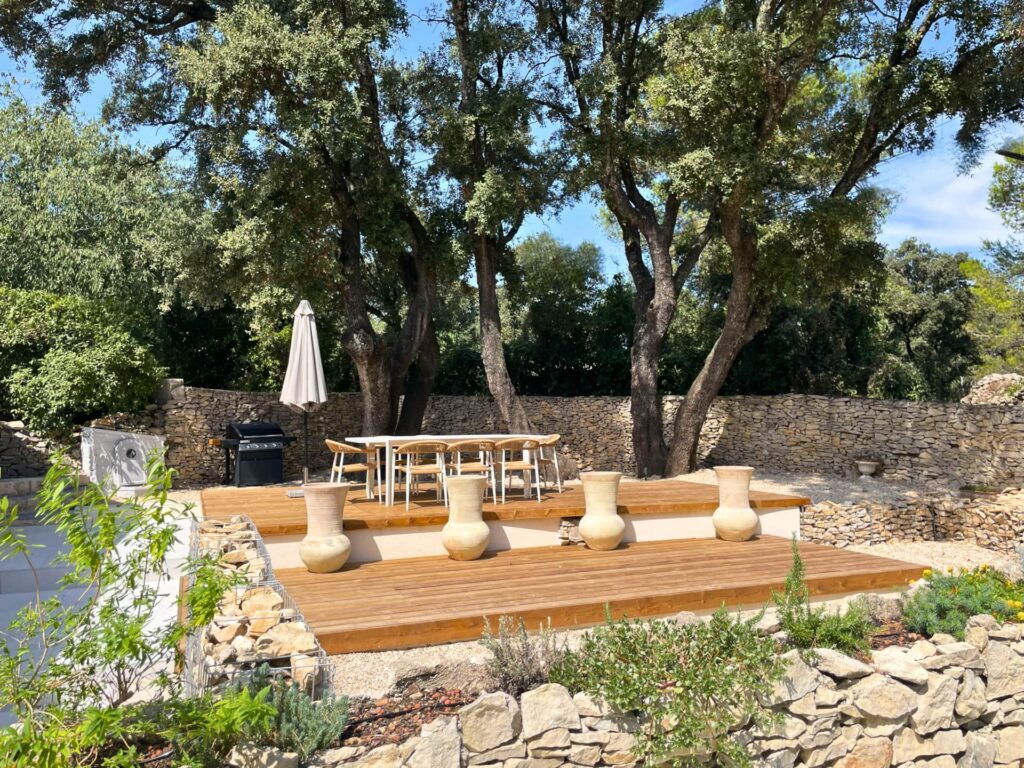 L’espace repas du Mazet Mahistre se trouve sur une vaste terrasse en bois, nichée sous des chênes majestueux, avec une vue dégagée sur la nature environnante sans aucun vis-à-vis. Cet endroit est idéal pour des repas en plein air grâce à sa grande table et ses 8 chaises confortables, parfaites pour accueillir famille et amis. Le charme du lieu se prolonge jusque tard dans la nuit, grâce à un éclairage extérieur conçu pour profiter des longues soirées d’été en toute convivialité et sérénité.
