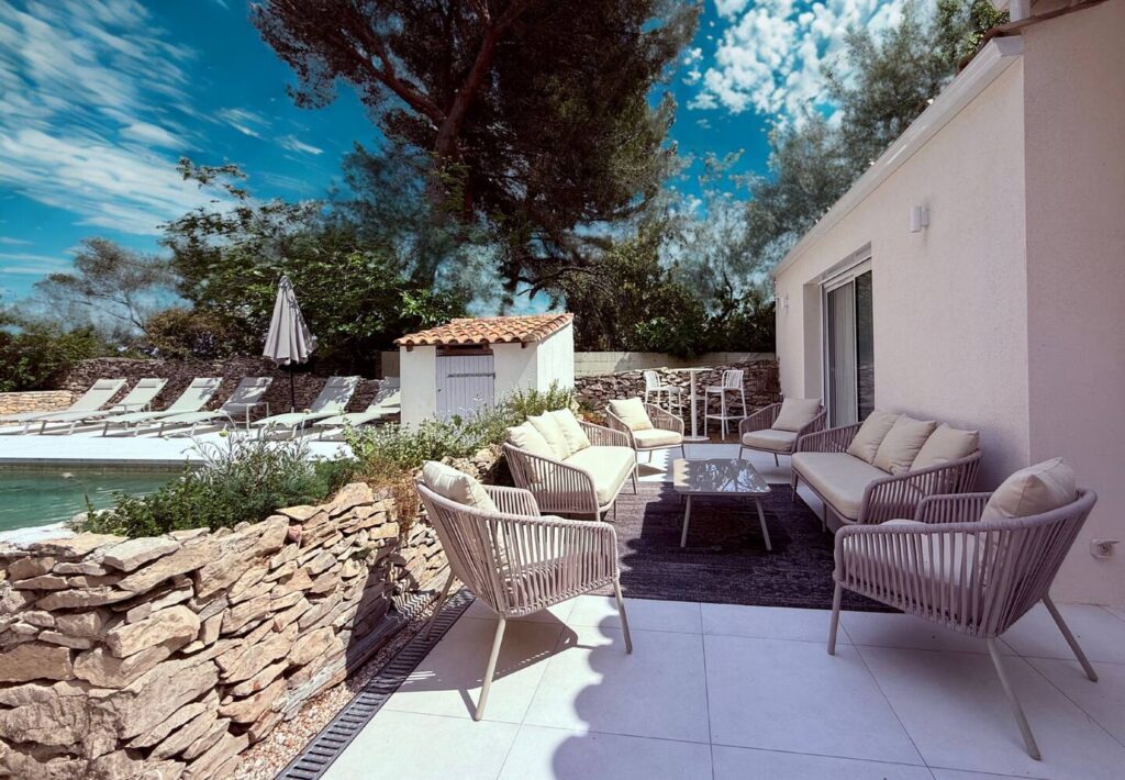 Le salon d’extérieur du Mazet Mahistre, situé au bord de la piscine, offre un cadre enchanteur avec une vue imprenable sur des chênes centenaires. Cet espace est parfait pour savourer un apéritif dans une ambiance sereine, bercé par le chant des cigales et l’ombre rafraîchissante des arbres majestueux. Idéal pour lire un bon livre ou simplement se détendre, ce coin de paradis combine élégance et confort. Que vous y passiez une matinée tranquille ou une soirée estivale, ce salon extérieur vous promet des moments de pure relaxation.