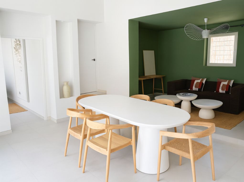 La salle à manger du Mazet Mahistre est un lieu chaleureux où l’on aime se retrouver. Elle s’articule autour d’une grande table en béton poli, accompagnée de six chaises en bois massif dotées d’accoudoirs. Grâce à son passe-plat, elle est directement connectée à la cuisine, offrant une circulation fluide et pratique lors des repas. Spacieuse et lumineuse, la pièce s’ouvre sur une vue imprenable : la piscine et les grands chênes environnants, sans aucun vis-à-vis. Un cadre idéal pour partager des moments conviviaux en famille ou entre amis.